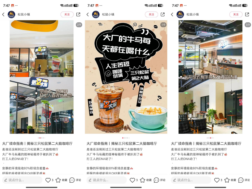 其次,零食巨頭通過(guò)店中店、外賣服務(wù)等輕資產(chǎn)模式降低初期投入,快速試水市場(chǎng)。良品鋪?zhàn)优cTims天好咖啡合作,在零食店內(nèi)嵌入咖啡柜臺(tái),利用現(xiàn)有門(mén)店網(wǎng)絡(luò)和流量資源,實(shí)現(xiàn)低成本擴(kuò)張。三只松鼠則通過(guò)美團(tuán)外賣上線“第二大腦”咖啡,覆蓋線上消費(fèi)場(chǎng)景,并計(jì)劃在社區(qū)、高校等場(chǎng)景開(kāi)設(shè)30多家店中店,進(jìn)一步豐富銷售渠道。