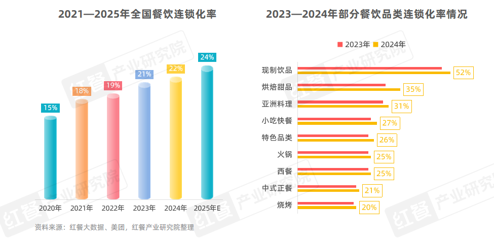 近年來,我國餐飲行業(yè)的連鎖化進程持續(xù)加速,連鎖化率從2020年的15%穩(wěn)步上升至2024年的22%,并預計在2025年進一步提升至24%左右。2023—2024年,各細分品類的連鎖化率也均有不同程度的提高。其中,現(xiàn)制飲品的連鎖化率從49%提升至52%,提高了3個百分點。