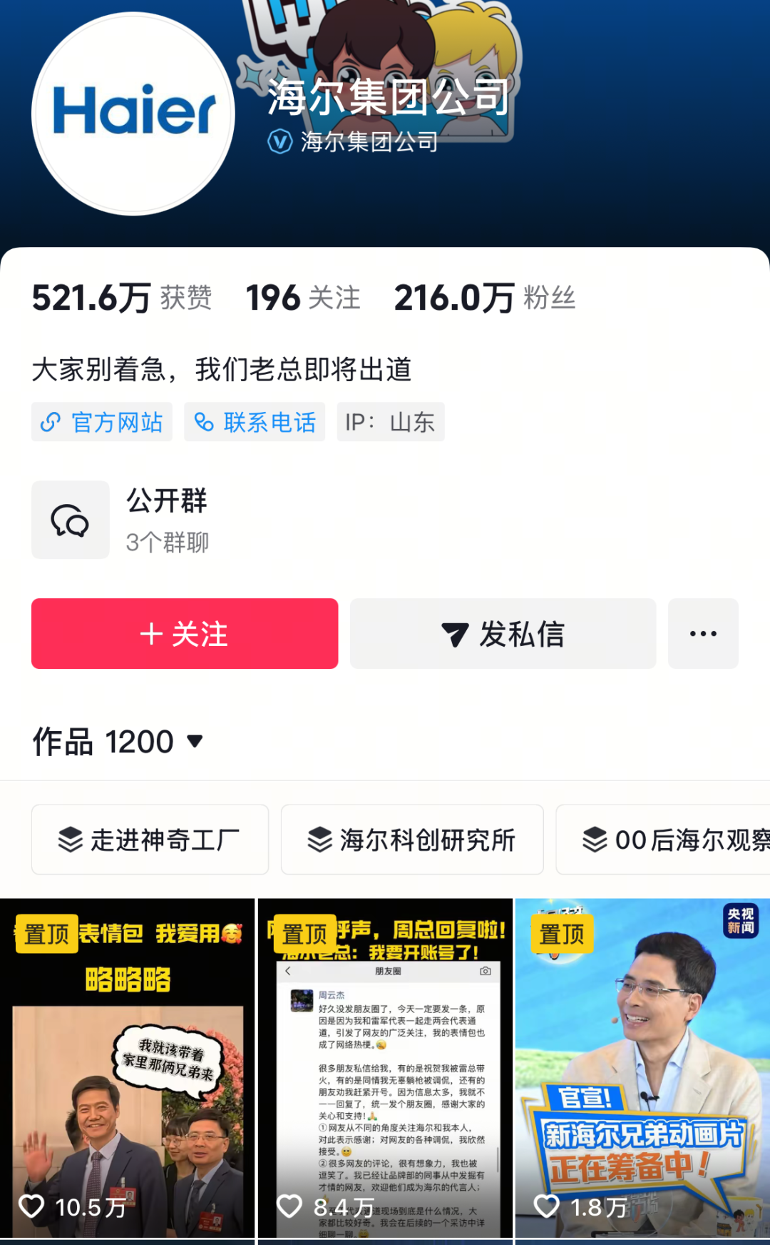 各大平臺的海爾官方賬號也紛紛發(fā)文,比如官方微博立刻發(fā)布了周云杰視察工廠、與員工研討的九宮格照片;微信公眾號推出《你不知道的周總36事》長文;抖音賬號發(fā)布海爾員工自制的“我為周總扛大旗”創(chuàng)意視頻,甚至直接把簡介改成了“大家別著急,我們老總即將出道”,又帶了一波話題度。