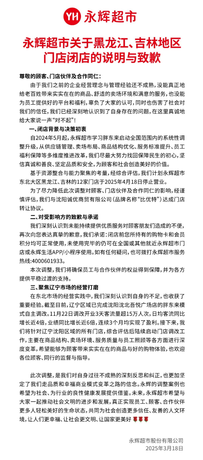 近日,《聯(lián)商網(wǎng)》獨(dú)家獲悉,永輝超市將一次性轉(zhuǎn)讓黑龍江和吉林兩地公司的12家門店,比優(yōu)特以收購(gòu)的方式接手。而在3月18日(今天),東北永輝超市公眾號(hào)發(fā)布《永輝超市關(guān)于黑龍江、吉林地區(qū)門店閉店的說明與致歉》。