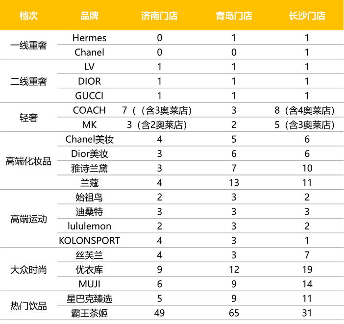 從品牌進(jìn)駐情況看,我們通過對(duì)比青島(省內(nèi)代表城市)與長(zhǎng)沙(人均GDP水平與濟(jì)南相近)的各層級(jí)品牌數(shù)量,可以看到濟(jì)南僅在二線重奢、輕奢和高端運(yùn)動(dòng)代表品牌(以安踏集團(tuán)為代表的高端運(yùn)動(dòng)品牌近年拓店積極)數(shù)量上與青島和長(zhǎng)沙基本持平,其余如一線重奢、高端化妝品、大眾時(shí)尚及熱門飲品代表品牌商均處于落后狀態(tài)。