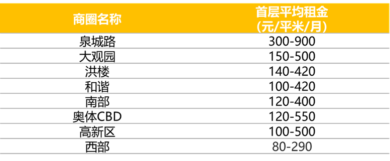 其中泉城路作為城市唯一核心商圈租金處于最高位,第二梯隊(duì)為大觀園、奧體CBD、高新與紅樓,西部商圈由于商業(yè)處于起步階段,租金水平最低。