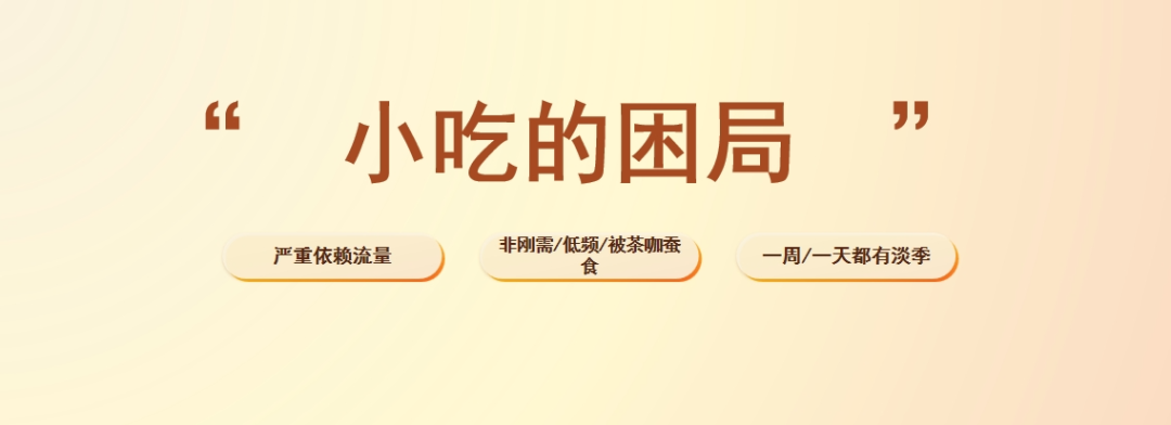 這兩年,很多小吃品牌都在想辦法讓自己更剛需,否則覆蓋的時段太少了。小吃嚴重依賴門店的流量,因為非剛需屬性,生意會被茶咖蠶食,位置稍差一點生意就更慘了。與快餐一樣,小吃也是一周、一天的生意都有“淡季”。