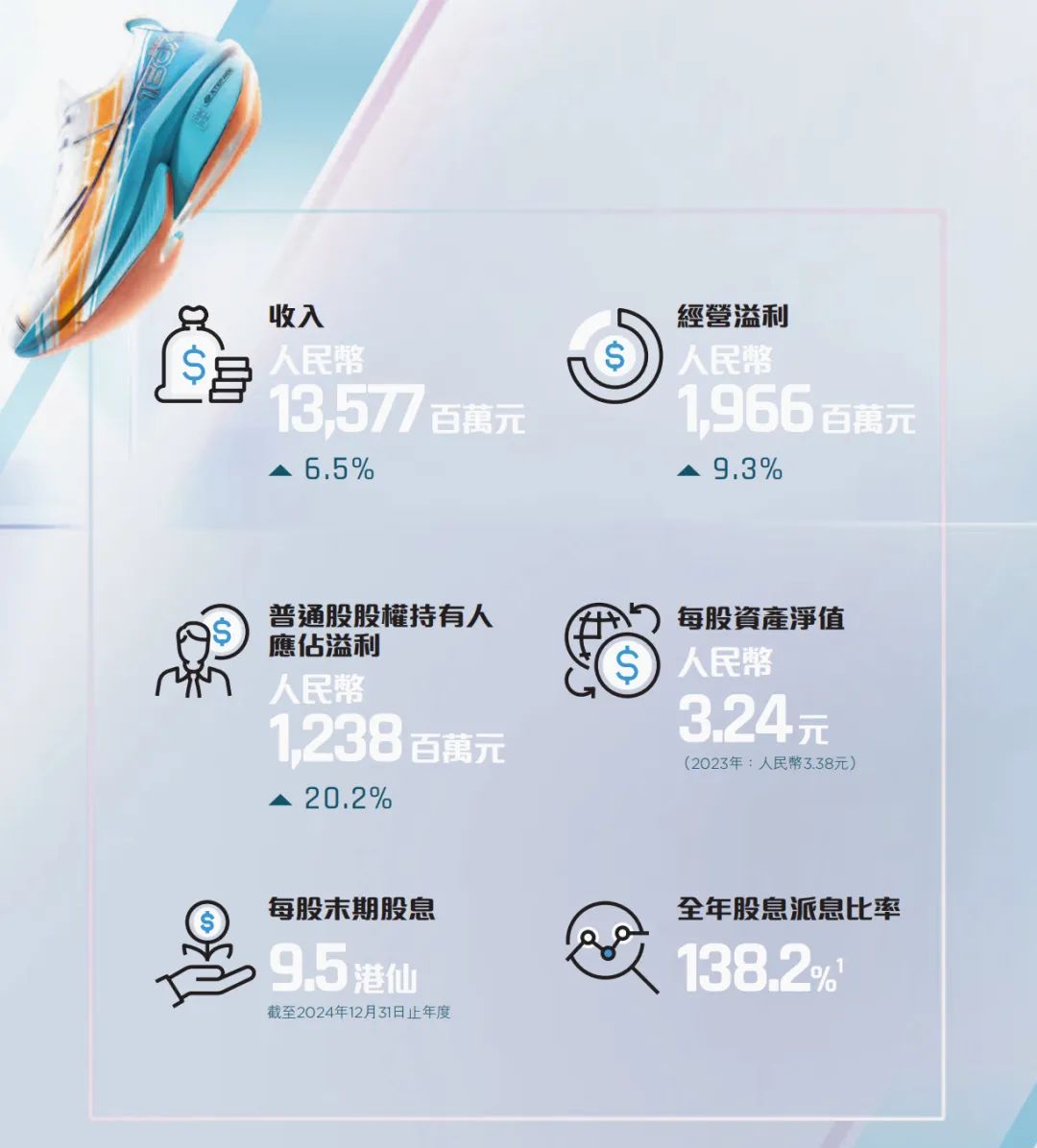 丁水波表示:“憑借集團(tuán)在跑步市場上的良好聲譽(yù),以及特步主品牌、索康尼及邁樂之間的協(xié)同效應(yīng),疊加政府未來持續(xù)推出刺激消費(fèi)信心和經(jīng)濟(jì)增長的長期政策支持下,我們已做好準(zhǔn)備迎接機(jī)遇,推動(dòng)集團(tuán)的未來成功!