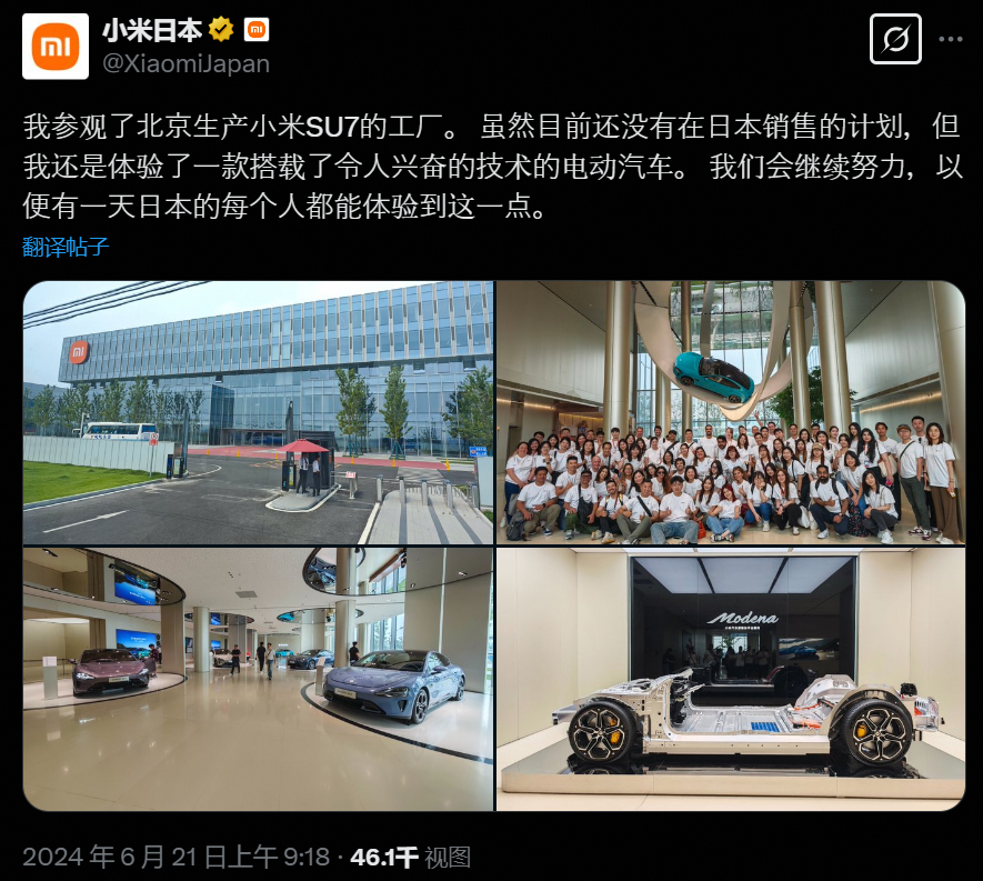 從這個(gè)模式推斷,小米在日本開“小米之家”實(shí)體店,從手機(jī)邁向IoT硬件的下一步,或許就是在海外推出汽車業(yè)務(wù)。此前,小米日本的推特賬號(hào)也曾專門發(fā)布關(guān)于日本員工進(jìn)入小米汽車工廠,體驗(yàn)小米SU7的內(nèi)容,并聲稱會(huì)努力爭(zhēng)取讓日本的用戶也能體驗(yàn)到這臺(tái)車。