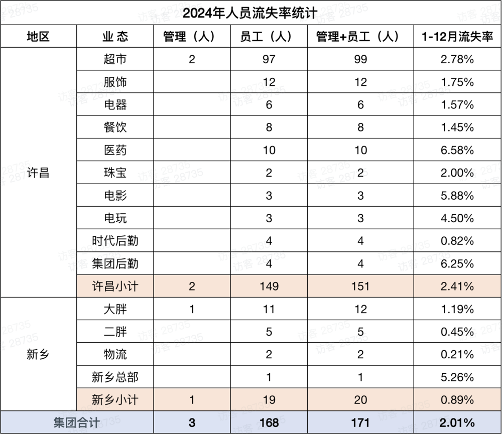 2025年1-2月,胖東來集團(tuán)流失了28人,其中包括2名管理人員及26名員工,人員流失率僅為0.33%。