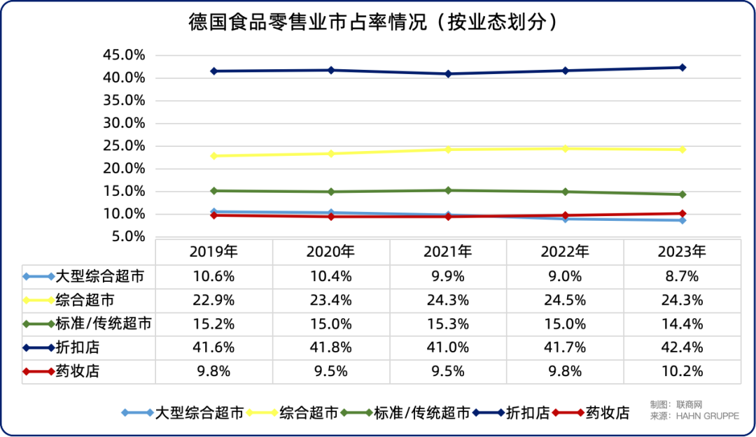 與此同時,據(jù)德國零售研究院(EHI Retail Institute)調查顯示,在這個歷經百年發(fā)展的成熟零售體系中,正呈現(xiàn)出兩大鮮明的趨勢:一方面,傳統(tǒng)大賣場雖通過持續(xù)改造升級積極適應消費新需求,但其市場占有率仍呈現(xiàn)結構性下滑;另一方面,以硬折扣店和藥妝店為主導的小型專業(yè)零售業(yè)態(tài),不僅長期占據(jù)市場主導地位,更保持著穩(wěn)健的年均增長率。
