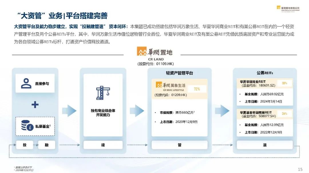 2024年,華潤置地資管規(guī)模同比增長8.1%,達到4,621億元。并形成了以置地為核心的“投-融-建”,由旗下獨立上市的輕資產(chǎn)管理平臺華潤萬象生活承載的“管”,以及以公募REITs為渠道的“退”的完整資本閉環(huán)。