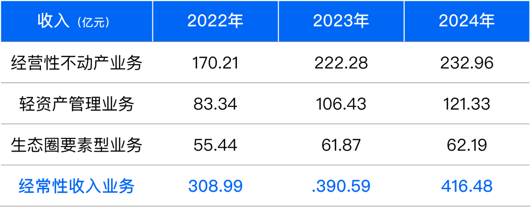 還有一個關(guān)鍵表達,“2024經(jīng)常性收入同比增長6.6%至416億元,可兩倍覆蓋股息及利息”。這句話翻譯過來的意思是,即使某一天華潤置地一平米住宅都沒有賣出去,光靠收租和輕資產(chǎn)管理費來支付貸款利息和股息,也沒問題。