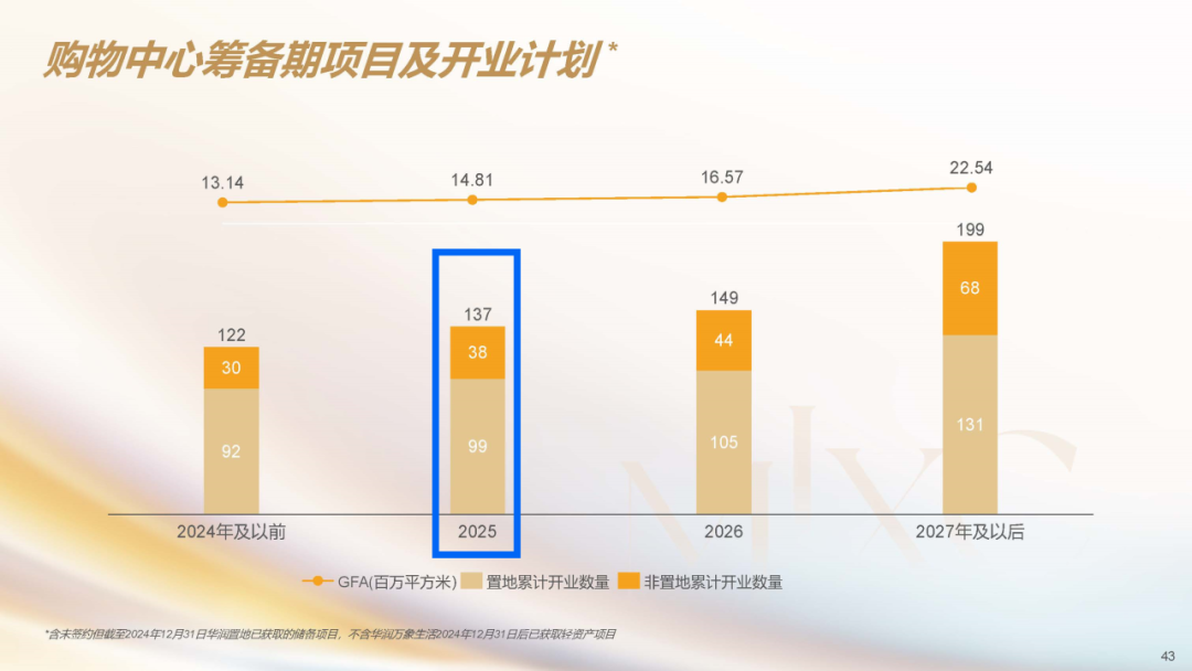 再來聊聊未來的展望。在開發(fā)全面萎縮的背景下,去年新開項目創(chuàng)歷史新高的華潤萬象生活,2025年節(jié)奏稍有放緩,但15座新項目也不是一個小數(shù)字。
