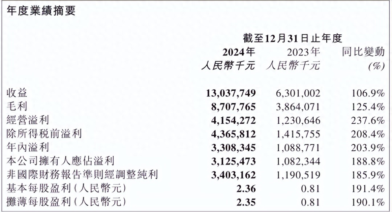 3月26日,泡泡瑪特發(fā)布了2024年全年財(cái)報(bào)。財(cái)報(bào)顯示,泡泡瑪特實(shí)現(xiàn)收益130.38億元,同比增長(zhǎng)106.9%;實(shí)現(xiàn)股東應(yīng)占溢利31.25億元,同比增長(zhǎng)188.8%。