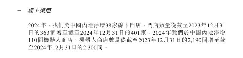 泡泡瑪特線下渠道的收入得以實(shí)現(xiàn)增長(zhǎng),要?dú)w功于線下門(mén)店和機(jī)器人商店。2024年,泡泡瑪特內(nèi)地新增線下門(mén)店38家。截至2024年底,泡泡瑪特在內(nèi)地有401家線下門(mén)店,2300間機(jī)器人商店;包括合營(yíng)在內(nèi),泡泡瑪特在港澳臺(tái)及海外的線下門(mén)店數(shù)量達(dá)到130家,機(jī)器人商店數(shù)量達(dá)到192臺(tái)。