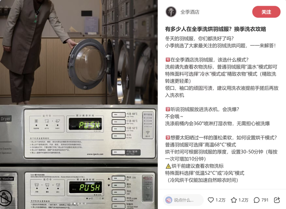 *全季酒店社媒賬號(hào)發(fā)布的“洗衣攻略”