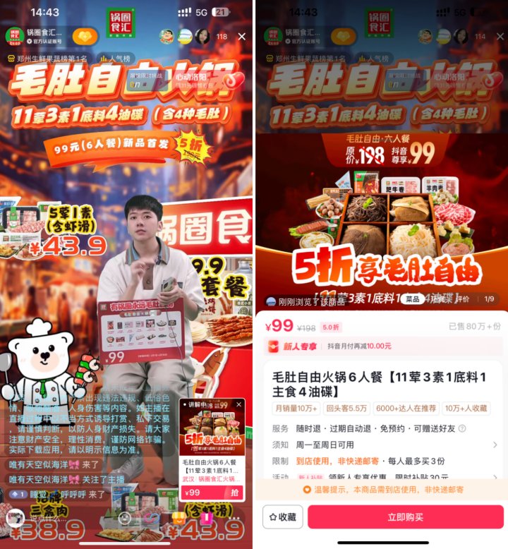 在鞏固線下門店網(wǎng)絡的同時,鍋圈加速抖音等線上平臺布局,通過“毛肚自由”等爆款套餐實現(xiàn)流量引流。