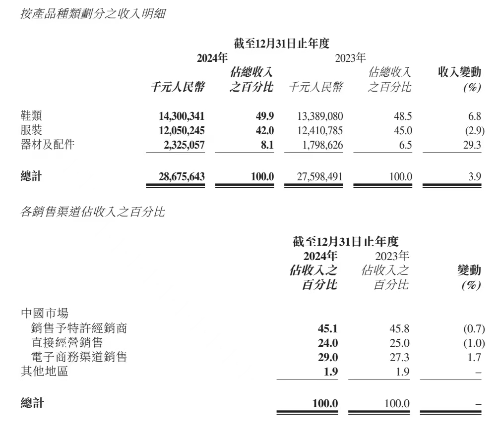 此外,2024年,李寧的研發(fā)投入占比為2.4%,同比增長了0.2個百分點。近十年來,李寧集團在研發(fā)的總投入已超過35億元。也得益于對運動科技的聚焦,報告期內(nèi),李寧在最能反映專業(yè)能力的鞋類業(yè)務(wù)上,營收占比也從去年的48.5%增至49.9%。