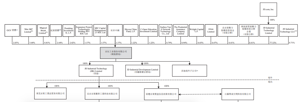 IPO前,京東通過JD Industrial Technology Limited持股77.32%;京東集團(tuán)創(chuàng)始人劉強(qiáng)東通過Max I&P Limited持股3.68%;阿布扎比投資基金 42XFund持股1.57%;阿布扎比政府旗下的Mubadala1.57%;紅杉中國持股1.37%。