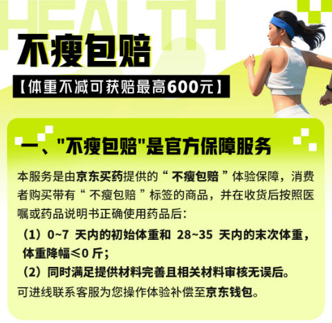 日前,京東買藥正式推出“不瘦包賠”服務(wù),為購(gòu)買特定減肥藥品的用戶提供了一種無(wú)風(fēng)險(xiǎn)的體驗(yàn)方式,確保用戶在使用過(guò)程中能夠獲得滿意的效果。若體重未達(dá)到預(yù)期降幅,用戶可申請(qǐng)最高600元的賠償。