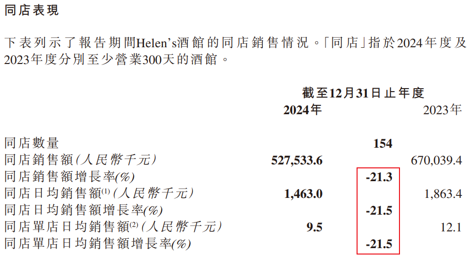 期內(nèi),同店銷售額(154家)實現(xiàn)5.28億元、同店日均銷售額146.3萬元,以及單店日均銷售額為9.5千元,同比分別下降21.3%、21.5%及21.5%。