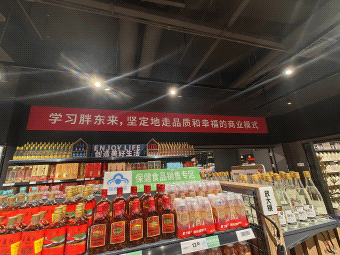 在品類(lèi)過(guò)渡上,延續(xù)和傳承了胖東來(lái)式的科學(xué)設(shè)置,入口處的左手邊的烘焙、水果,使顧客一進(jìn)場(chǎng)就能被調(diào)動(dòng)味蕾體驗(yàn)和視覺(jué)享受,右手邊的胖東來(lái)自有品牌專(zhuān)區(qū)又能激發(fā)信任和品質(zhì)心智,后續(xù),人間煙火的熟食、琳瑯滿(mǎn)目的冷藏乳飲、鮮活生猛的水產(chǎn)海鮮等依次展開(kāi),每個(gè)品類(lèi)都最大程度的釋放了其特色和亮點(diǎn);而綜合考慮品類(lèi)特性,瓷器碗碟被安置與動(dòng)線(xiàn)末端,并提供了包扎服務(wù),細(xì)節(jié)滿(mǎn)滿(mǎn)。