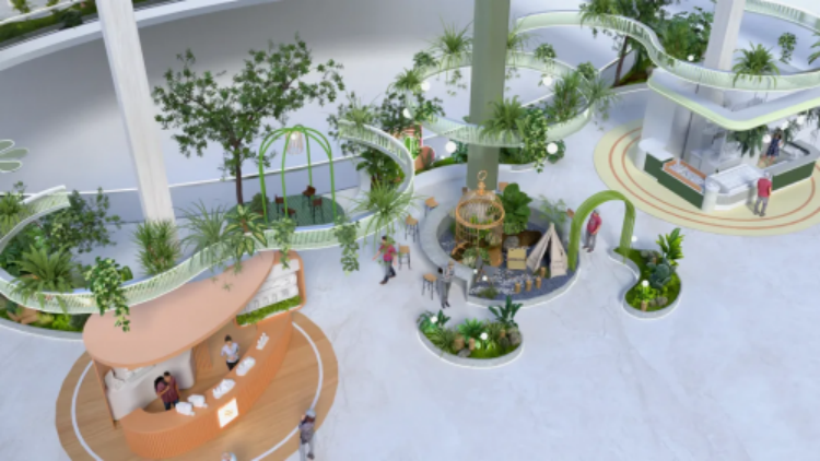 以即將開業(yè)的寧波姜山萬達(dá)廣場為例,"垂直街區(qū)+生態(tài)中庭"的復(fù)合設(shè)計,通過場景敘事與空間交互的革新,打造集消費、社交、情感共鳴于一體的“趣享森活”場,實現(xiàn)從功能載體到精神場域的進(jìn)階。 將光、水、植被與建筑美學(xué)深度融合,構(gòu)建出極具呼吸感的森系場景體系。 項目在5層核心區(qū)打造10米挑空、500㎡立體森林花園,以原生綠植結(jié)合品牌外擺,形成“自然消費共生體”。