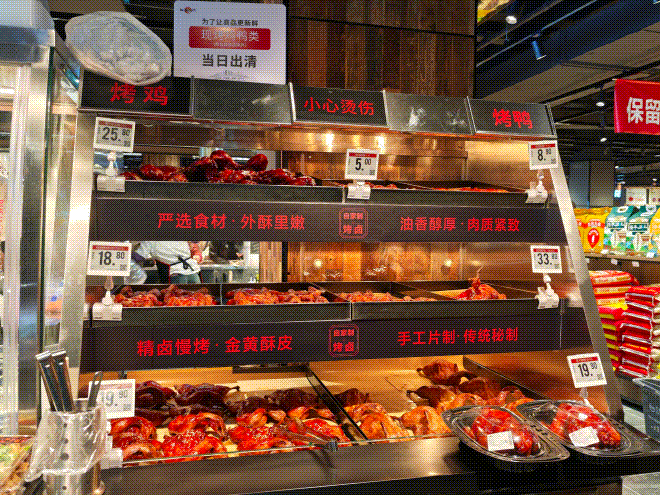 生鮮方面,門店在商品品質(zhì)和品類豐富度方面進一步優(yōu)化提升。肉禽板塊,引進了優(yōu)質(zhì)黑豬肉、貴州小黃牛等品類;水果板塊,增加了水果撈,果汁、果茶等品類;蔬菜板塊,為了保證安全衛(wèi)生,蔬菜葉菜、豆制品、分切菜全部以精包的方式在低溫柜陳列銷售;水產(chǎn)板塊,也極大豐富了品類,從新西蘭翡翠鮑到紅毛蟹、皇帝蟹、大紅龍蝦,應有盡有。