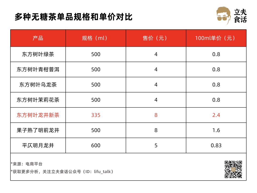 這款單品的售價也更貴一些。對比一下其他無糖茶產(chǎn)品單價就知道,8元一小瓶的售價一點都不便宜,100ml的單價是東方樹葉其他產(chǎn)品的近3倍,也顯著高于其他品牌的龍井茶單品。