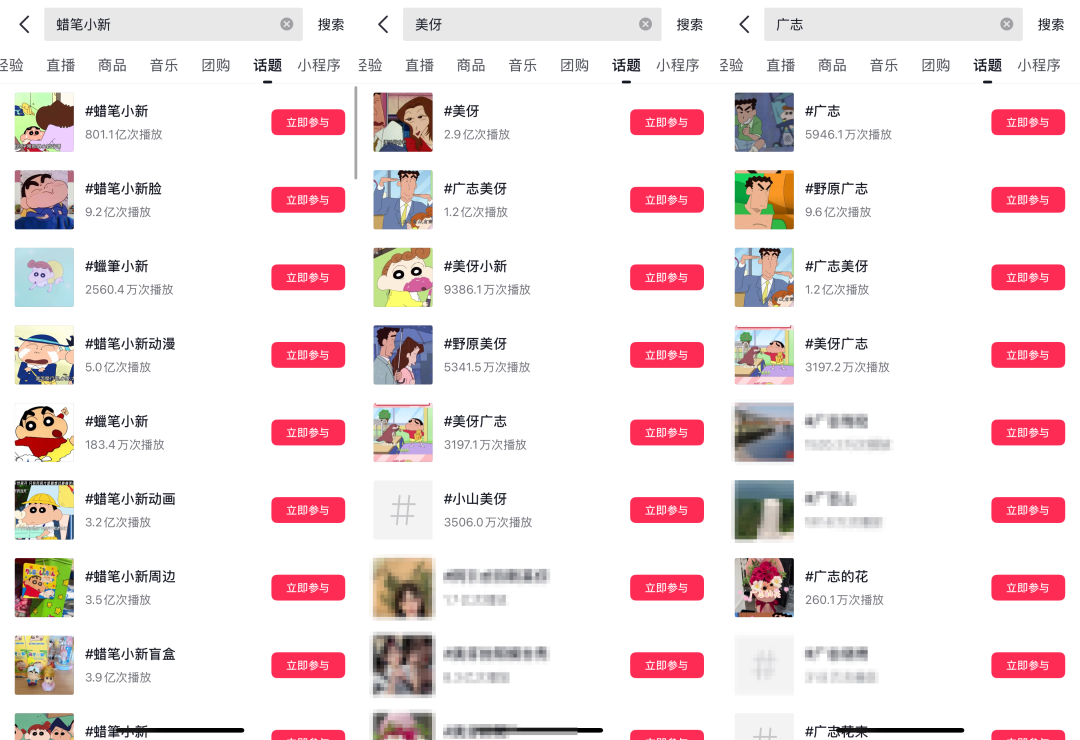 而作為經(jīng)典的童年回憶殺,蠟筆小新相關內容,在社交媒體中一直都保持著較高的熱度。在抖音中,搜索相關話題的累計播放量達近千億次。