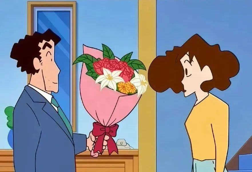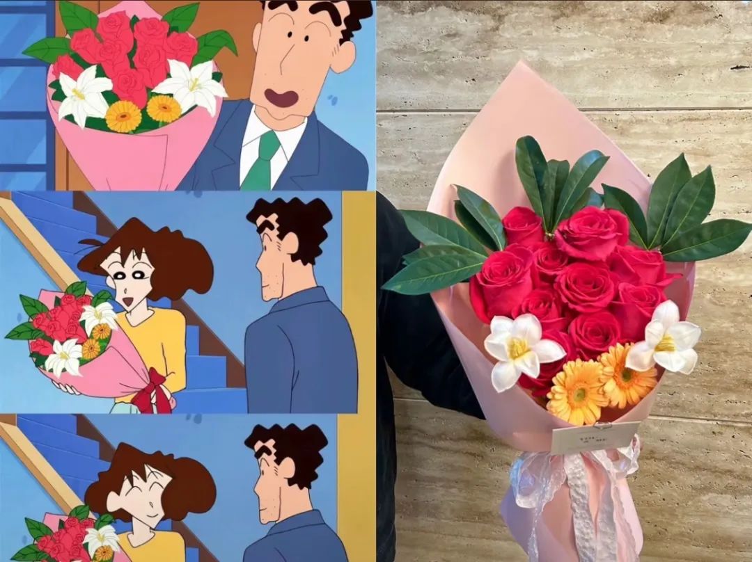 最近,網(wǎng)友們紛紛在社交媒體中曬出另一半送的,《蠟筆小新》里野原廣志送給美伢的同款花束。在劇里,這個總是被房貸壓得喘不過氣的上班族,在某個再普通不過的傍晚,拿出藏在身后的花束,眼睛亮晶晶地對美伢說“我偶爾也會想是不是應該買一束鮮花送給你……”。