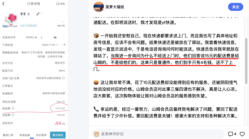 山姆曾和京東深度合作,但在沃爾瑪清倉京東股票后,山姆開始尋求第三方合作伙伴,在這個(gè)空檔期,有消費(fèi)者也公開吐槽,山姆配送服務(wù)下滑,且極度壓縮合作方利潤(rùn)空間。