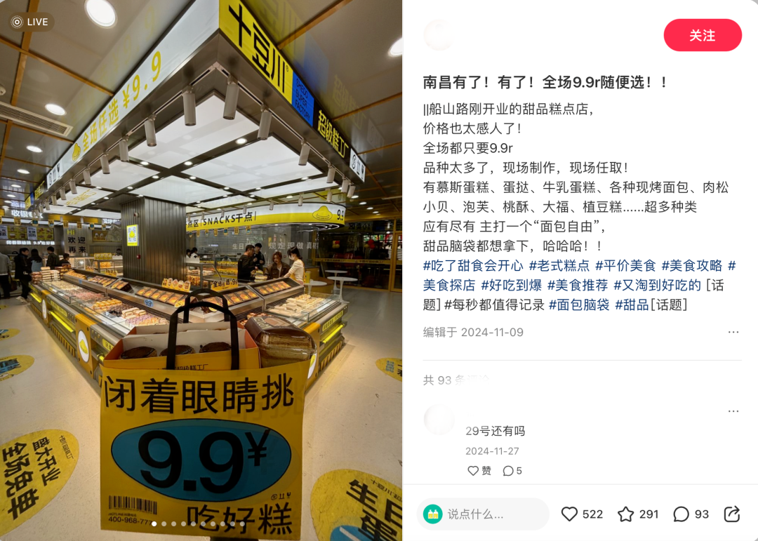 當(dāng)一線白領(lǐng)吐槽“面包越賣越貴”“月薪×萬吃不起面包”時(shí),一批主打“全場(chǎng)9塊9”的烘焙工廠(也叫面包工廠、超級(jí)糕工廠,下文統(tǒng)稱烘焙工廠),用5.8元的提拉米蘇,8.8元的菠蘿泡芙,席卷縣城,成為縣城青年買面包的新選擇。