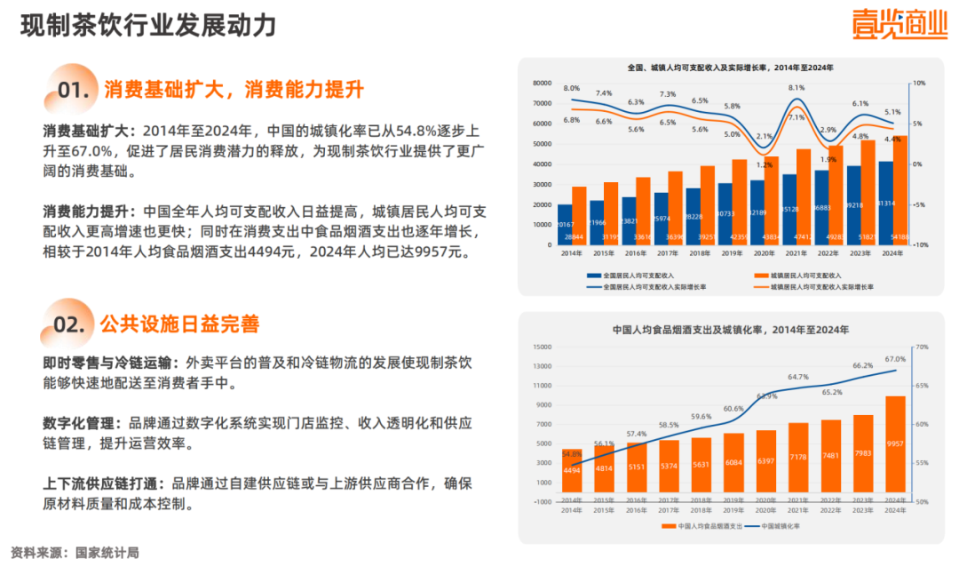 一是消費(fèi)基礎(chǔ)擴(kuò)大,消費(fèi)能力提升。2014年至2024年,中國(guó)的城鎮(zhèn)化率已從54.8%逐步上升至67.0%,促進(jìn)了居民消費(fèi)潛力的釋放,為現(xiàn)制茶飲行業(yè)提供了更廣闊的消費(fèi)基礎(chǔ)。