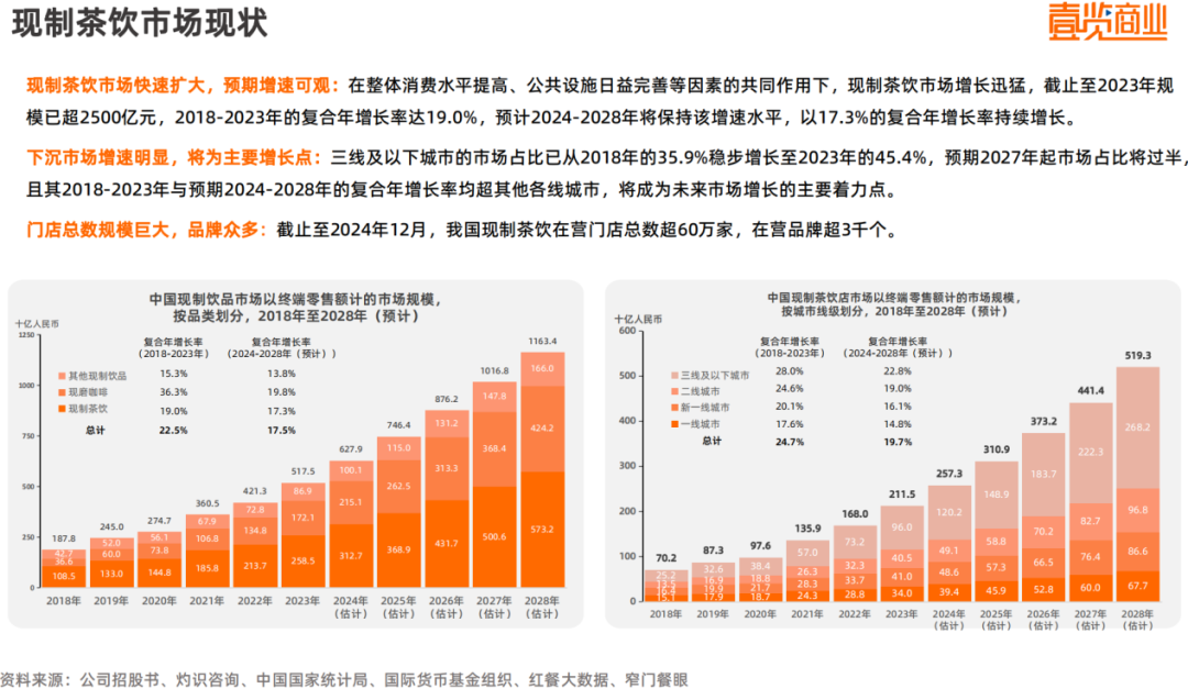 就這樣,整個(gè)行業(yè)迅速發(fā)展壯大。2018年,現(xiàn)制茶飲市場(chǎng)規(guī)模已超千億,并在2018年至2023年間,保持著19.0%的復(fù)合年增長(zhǎng)率,預(yù)計(jì)2024年至2028年,現(xiàn)制茶飲市場(chǎng)將以17.3%的年復(fù)合增長(zhǎng)率穩(wěn)步增長(zhǎng),2028年的市場(chǎng)規(guī)模有望發(fā)展至5732億元。