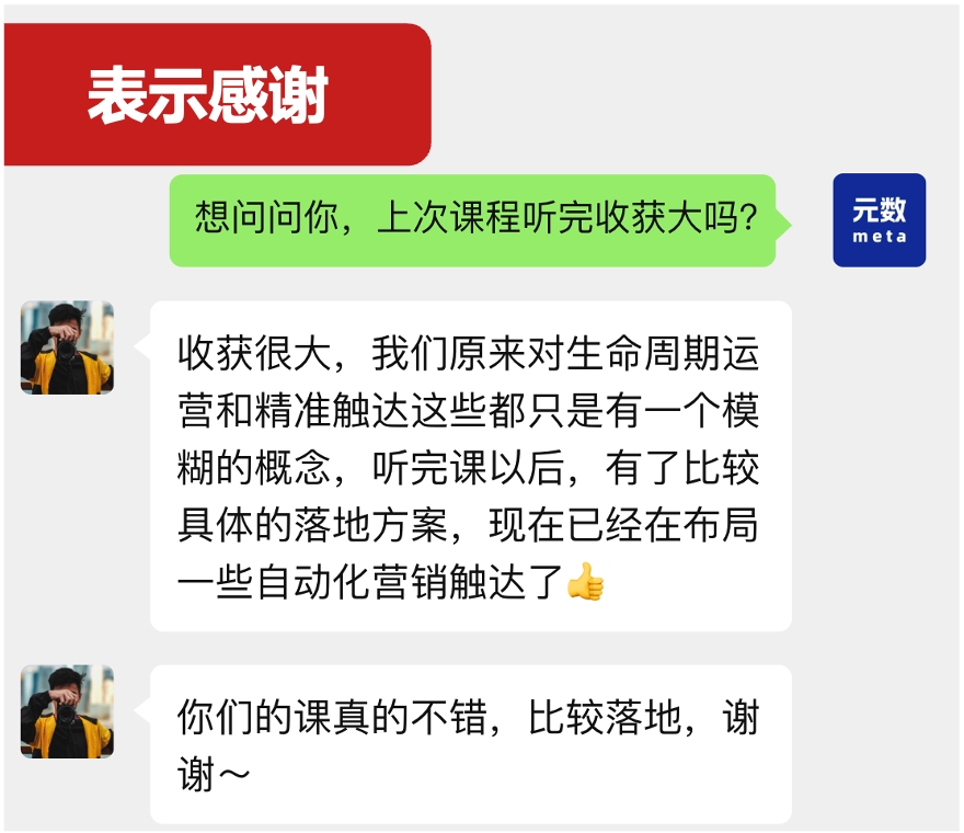 同時(shí)課后還為大家安排了1v1企業(yè)問(wèn)診環(huán)節(jié):元數(shù)科技智庫(kù)團(tuán)現(xiàn)場(chǎng)答疑,針對(duì)性解決會(huì)員體系搭建、私域增長(zhǎng)停滯等難題,助力企業(yè)快速落地