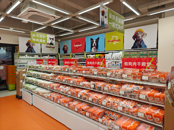 當(dāng)公共服務(wù)領(lǐng)域邁出這一步時(shí),商業(yè)世界早已掀起更深層的變革。當(dāng)筆者走進(jìn)「派特鮮生」,生骨肉、三文魚沙拉與寵物生日蛋糕擠滿冷柜,定制熱食區(qū)飄出雞胸肉的烘焙香氣。這個(gè)對(duì)標(biāo)盒馬的新零售樣本,正用“鮮食革命”重構(gòu)寵物消費(fèi)場(chǎng)景,將“毛孩子經(jīng)濟(jì)”推至新維度。