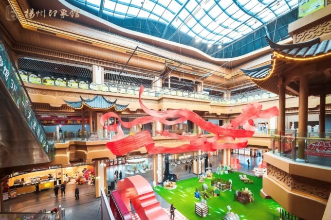 在文旅方面,揚州首個沉浸式文化主題商業(yè)體——揚州印象館,成為往來游客抵達揚州后了解這座城市的第一窗口。一樓定位“現(xiàn)代化揚州”,集合了星巴克、肯德基、樂樂茶、文化書房等品牌;二樓定位“市井之揚州”,采用曲徑通幽的設(shè)計手法,以中式裝潢重現(xiàn)揚州傳統(tǒng)集市的模樣,匯聚了眾多餐飲和文創(chuàng)商戶;三樓定位“溫暖之揚州”,提供了諸多的游樂場所和親子空間,包括江蘇最大的室內(nèi)萌寵樂園。