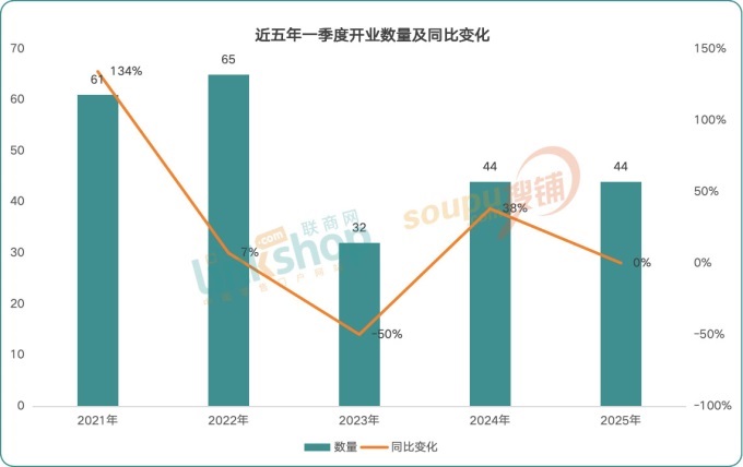 據(jù)聯(lián)商網(wǎng)零售研究中心統(tǒng)計,2025年第一季度全國新開業(yè)的商業(yè)項目數(shù)量44個(不含專業(yè)市場、家居商場、酒店及寫字樓、純商業(yè)街區(qū),商業(yè)建筑面積≥2萬m²),同比去年持平。新增商業(yè)建筑面積283.65萬m²,平均單體建筑面積約6.45萬m²。