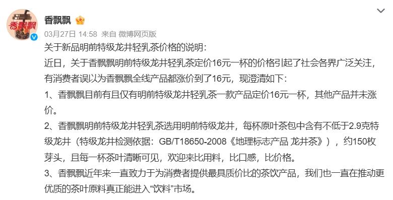 最近,“香飄飄奶茶漲至16元一杯”登上微博熱搜,引發(fā)網(wǎng)友熱議。隨后,香飄飄官方急忙出來辟謠,表示“目前有且僅有明前特級龍井輕乳茶一款產(chǎn)品定價16元一杯,其他產(chǎn)品并未漲價!