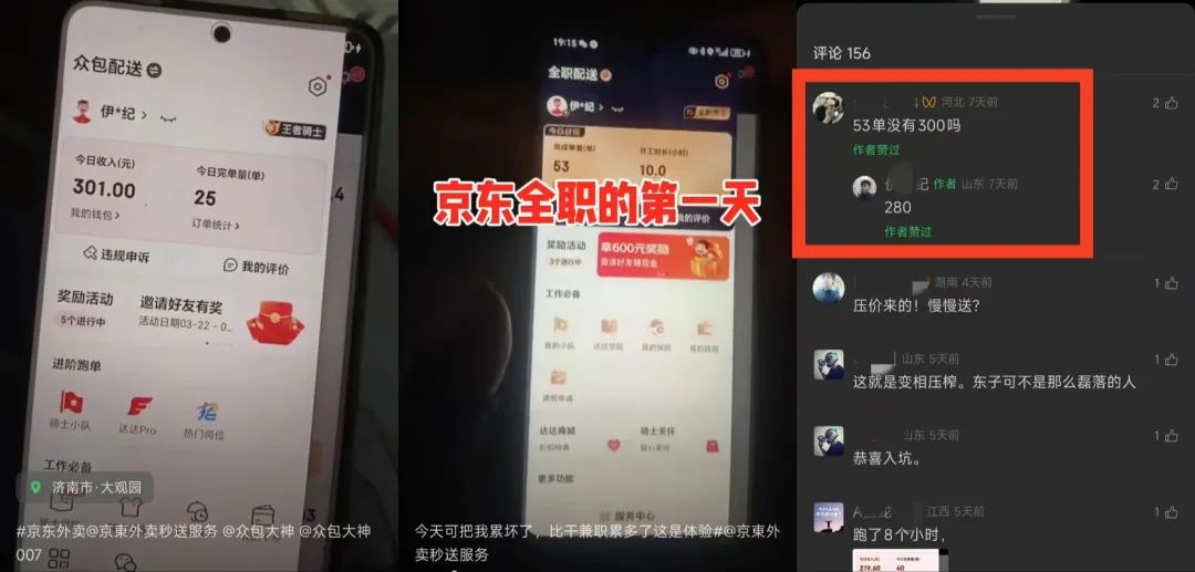 對此,一位剛剛從眾包轉為全職的京東騎手,專門發(fā)視頻對比了入職前后的收入:跑眾包時,一天25單收入300元;成為全職后,第一天跑了53單,收入不到300元。如果全職的代價是單價腰斬、工時翻倍,誰還敢要免費的五險一金?