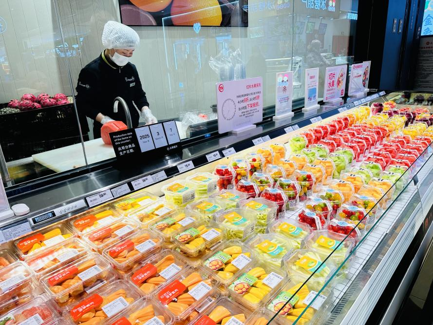 不僅如此,永輝超市全國調改店正在用實際行動守護老百姓的菜籃子,開展以“零隔夜”為核心理念的日清行動,覆蓋了水果、蔬菜、肉禽、水產四大品類超600個商品,通過庫存日清、臺面商品日清及商品挑選日清的管理體系保障商品和服務品質。針對果切這類“嬌貴”商品,切好四小時后打八折,六小時打六折,八小時下架報損。這種明確的商品時間管理(預期服務)讓消費者在挑選時多了一份安心!吧洗钨I的打折的果切,口感依然清甜如初!币晃活櫩头窒淼馈