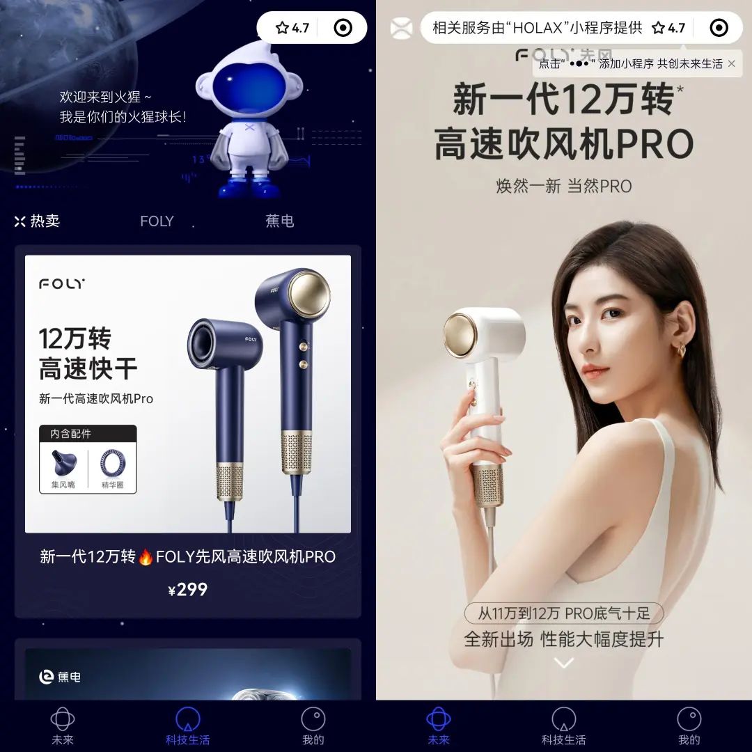 辛巴在2020年推出“辛選幫”APP,又在2022年推出電商平臺“HOLAX”,前者針對主播群體,提供一站式線上直播供貨服務,后者則是一個自營品牌和電商平臺,在上線之初就推出了FOLY高速吹風機、本制抗皺精華和吾雙鯨鞋三個自營品牌產(chǎn)品。