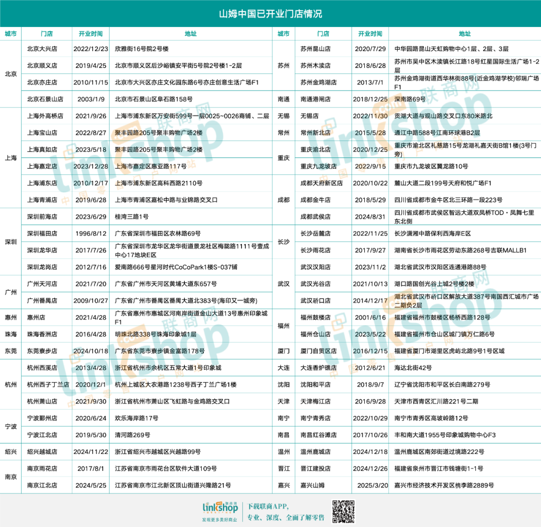 2015年后,隨著中國消費升級趨勢顯現(xiàn),山姆加快擴(kuò)張,尤其2020年后保持每年5-6家的開店速度。2024年開出6家新店,包括首次進(jìn)入泉州晉江等縣級市場。2025年將是山姆在華開店最密集的一年,計劃新開7家門店,覆蓋嘉興、合肥等多座城市,其中張家港將成為第三個“縣級店”。