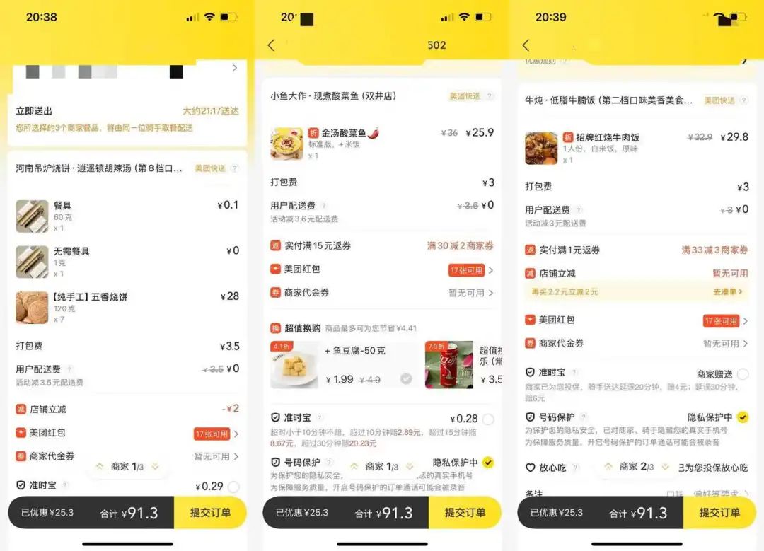 在商圈內(nèi),用戶可以在最多三家店鋪下單,但每家都需要達(dá)到商家的起送價,起送價和單獨(dú)點(diǎn)餐并沒有差別?绲昙宵c(diǎn)單的好處是,用戶可以在一個頁面內(nèi)點(diǎn)餐,不用來回跳轉(zhuǎn),同時,方便騎手取餐,提高整體配送效率。不過配送價格上,和單獨(dú)點(diǎn)也沒有差別。