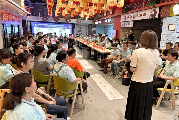 在距離許昌1011公里的上饒,他們還面臨著水土不服的困擾。上饒濕冷的天氣,讓不少幫扶人員身體出現(xiàn)不適,日夜加班更是讓他們疲憊不堪,有人發(fā)燒、咳嗽,甚至臥病在床。胖東來幫扶嘉百樂的團(tuán)隊(duì)負(fù)責(zé)人紅麗姐在調(diào)改期間日夜操勞,即便身體不適也隱瞞病情,生怕我們?yōu)樗龘?dān)心。當(dāng)我們得知她生病后,她依然安慰我們,讓我們放輕松,開心快樂的將調(diào)改工作持續(xù)下去。即便面對(duì)如此艱難的狀況,他們這群可愛、無私、大愛的人們始終保持著積極樂觀的態(tài)度。他們?cè)谏橡埥ㄔO(shè)食堂,堅(jiān)持鍛煉身體,用歡聲笑語驅(qū)散疲憊與困難,用積極向上的氛圍感染著身邊的每一個(gè)人。他們的熱情、樂觀以及嚴(yán)謹(jǐn)高效的工作狀態(tài),如同一束束溫暖的陽光,照亮并溫暖了嘉百樂員工的心,也讓上饒的顧客感受到了真誠、善良和快樂。