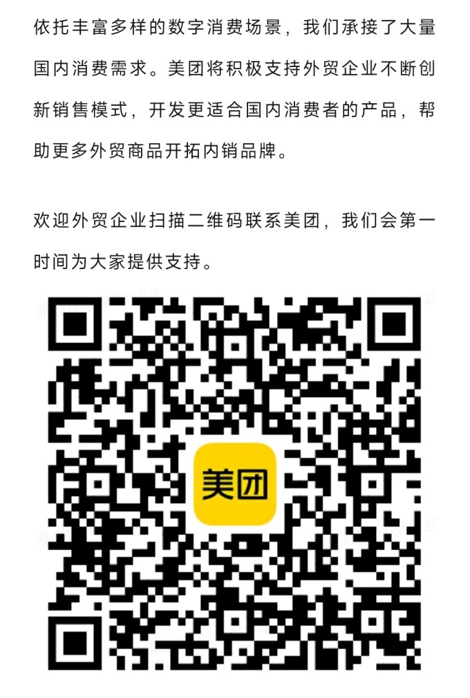 4月12日,美團宣布全渠道支持外貿(mào)企業(yè)開拓國內(nèi)市場,并已成立專項,推出五項舉措,在“商家入駐、經(jīng)營扶持、品牌打造”等方面開設綠色通道,歡迎外貿(mào)商家進駐美團,全力支持外貿(mào)商品上線美團各業(yè)務,合力打造繁榮共贏的“內(nèi)外貿(mào)一體化”生態(tài)體系,讓優(yōu)質外貿(mào)商品惠及更多國內(nèi)消費者。