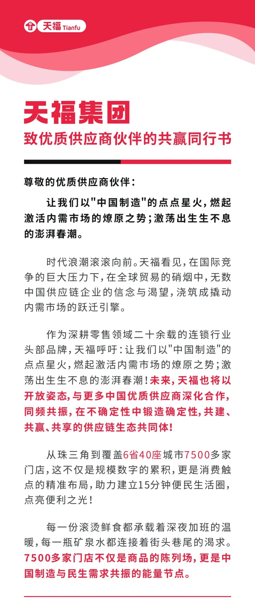 天福也將以開放姿態(tài),與更多中國優(yōu)質供應商深化合作同頻共振,在不確定性中鍛造確定性,成為共建、共贏、共享的供應鏈生態(tài)共同體。