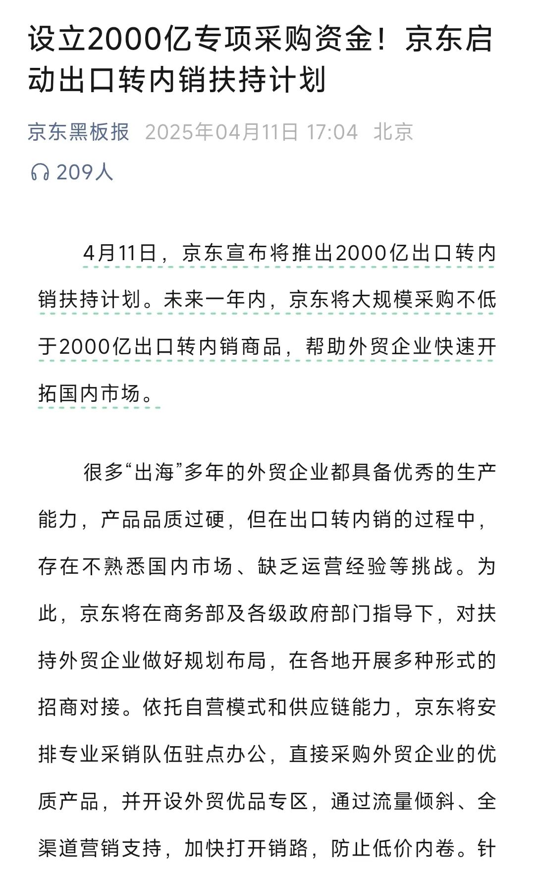 4月11日,京東宣布將推出2000億出口轉內(nèi)銷扶持計劃。未來一年內(nèi),京東將大規(guī)模采購不低于2000億出口轉內(nèi)銷商品,幫助外貿(mào)企業(yè)快速開拓國內(nèi)市場。