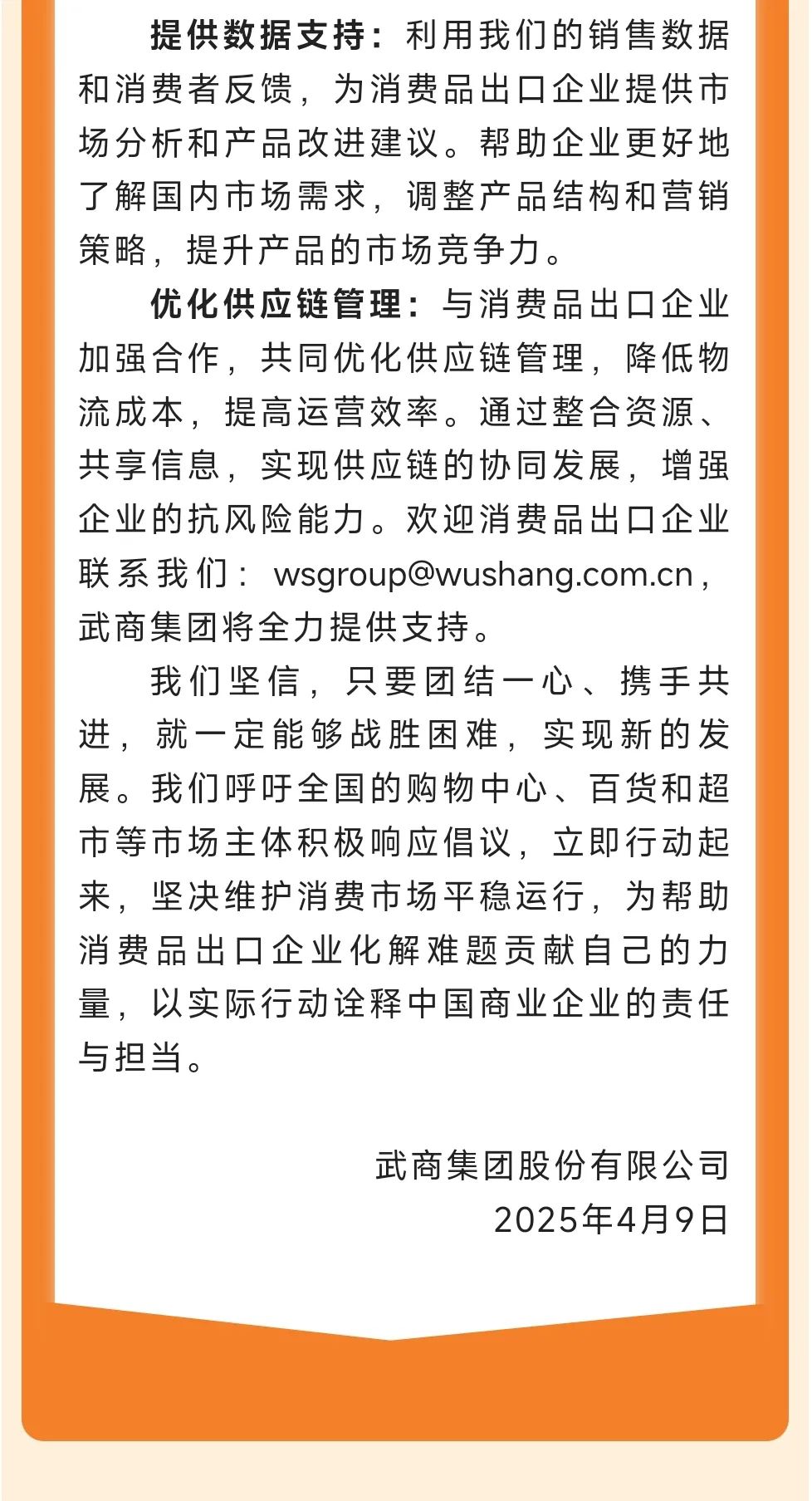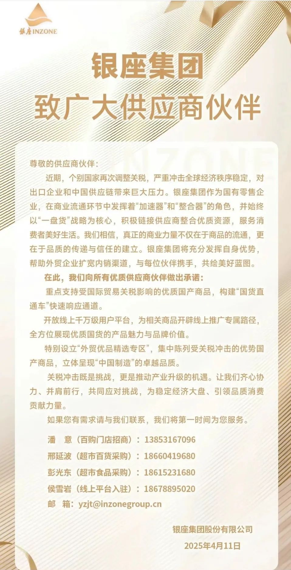 同時,銀座集團還呼吁供應商伙伴齊心協(xié)力、并肩前行,共同應對挑戰(zhàn),為穩(wěn)定經(jīng)濟大盤、引領品質消費貢獻力量。