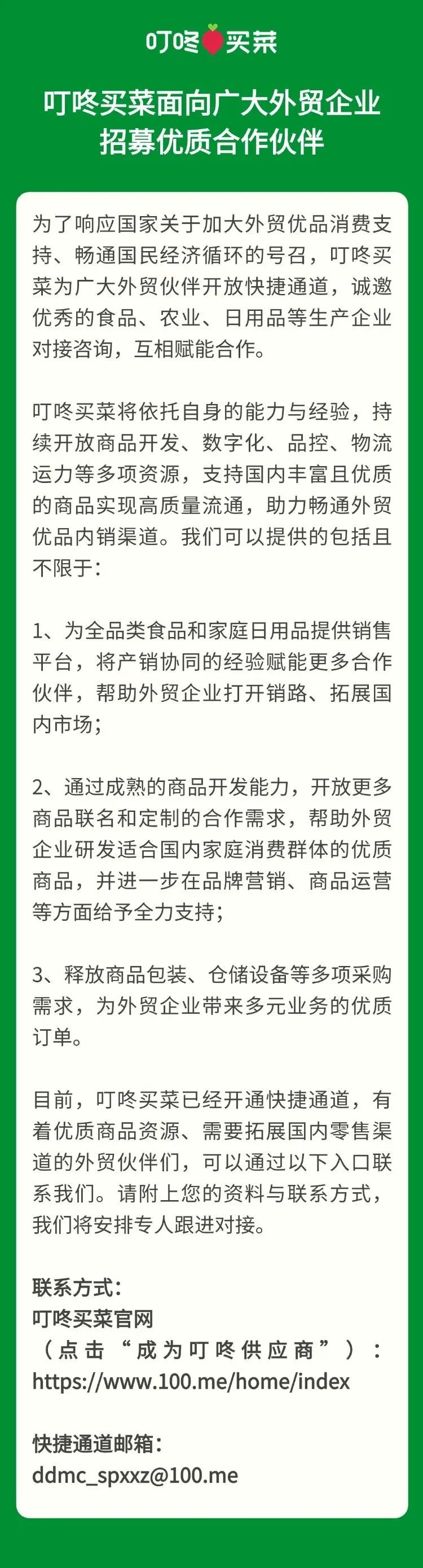 4月11日,叮咚買菜為廣大外貿(mào)伙伴開放快捷通道,誠邀優(yōu)秀的食品、農(nóng)業(yè)、日用品等生產(chǎn)企業(yè)對接咨詢,互相賦能合作。