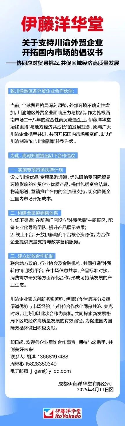 4月11日,伊藤洋華堂發(fā)布關于支持川渝外貿(mào)企業(yè)開拓國內(nèi)市場的倡議書,作為扎根西南市場二十八年的綜合性商貿(mào)流通企業(yè),伊藤洋華堂始終秉持“與地方經(jīng)濟共成長”的發(fā)展理念,愿與廣大川渝企業(yè)攜手并進,共同開拓國內(nèi)市場新空間,助力“川渝制造”向“川渝品牌”轉型升級。