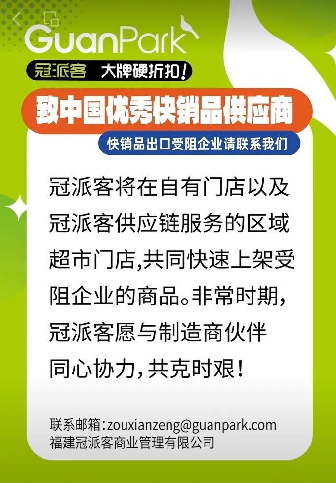 4月11日,冠派客在官方視頻號發(fā)布致中國優(yōu)秀快銷品供應商的一封信,將在自有門店以及冠派客供應鏈服務的區(qū)域超市門店,共同快速上架受阻企業(yè)的商品。